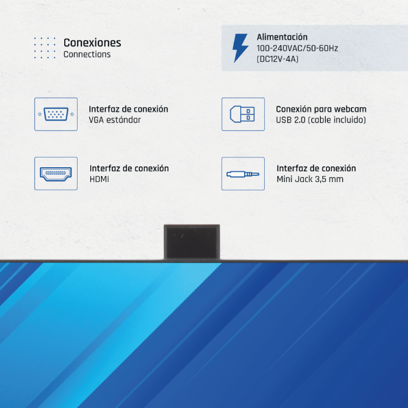 - Alimentación: 100-240VAC/50-60Hz (DC12V-4A)